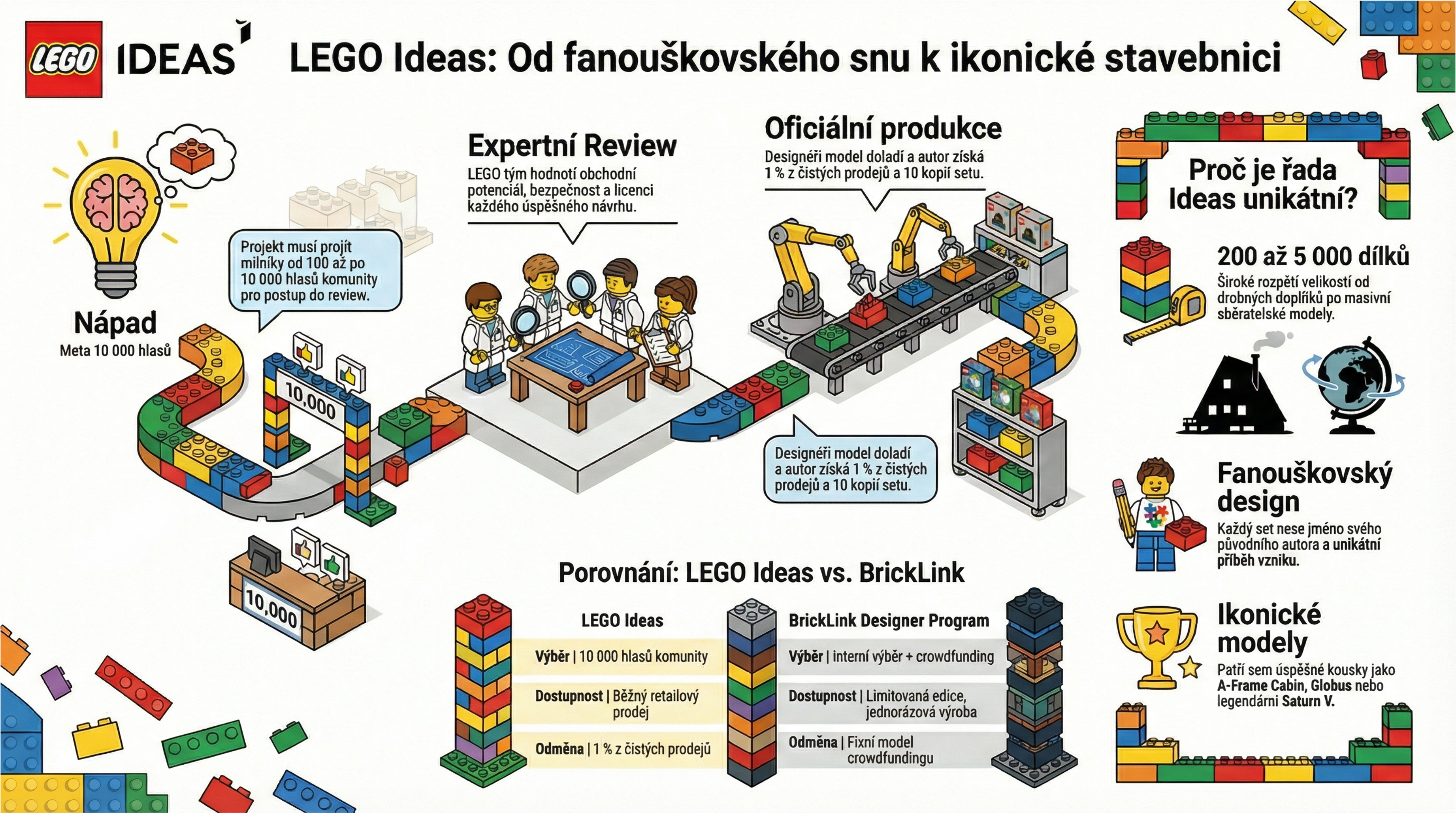 LEGO® Ideas spojuje komunitní hlasování a oficiální produkci. Sety vznikají na základě 10 000 podpor fanoušků a často představují unikátní licence či originální koncepty, které po ukončení výroby získávají silnou sběratelskou hodnotu.
