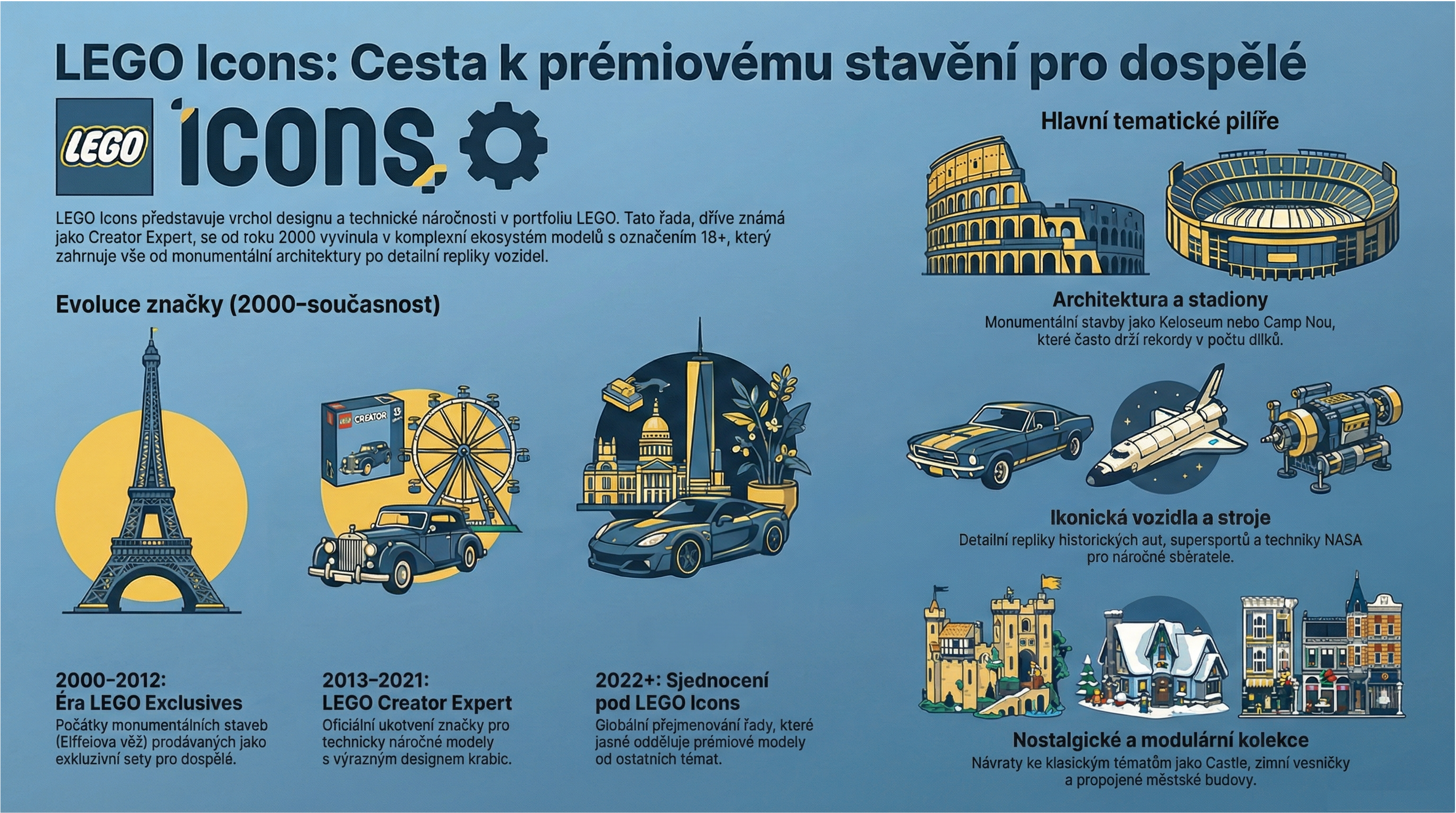 LEGO® Icons zahrnuje prémiové modely určené dospělým stavitelům – od architektury přes vozidla až po tematické kolekce. Vyšší cenová hladina, 18+ zaměření a designový charakter dělají z těchto setů stabilní sběratelskou kategorii.